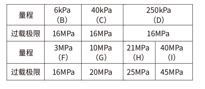静压影响:±(0.05%URL+0.075%Span)/额定⼯作压±0.25%;±(0.1%URL+0.15%Span)/额定压⼒