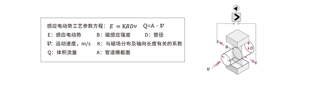 所示,上下两端的两个电磁线圈产生恒定或交变磁场,当导电介质流过电磁流量计时,做切割磁力线运动,此时会产生一个感应电动势并被两个测量电极检测出来,这个感应电动势大小与导电介质流速、磁场的磁感应强度、导体宽度(流量计测量管内径)成正比,然后变送器将它进行放大,根据管道横载面积计算出体积流量,再通过运算就可以得到介质流量。