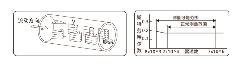 式中f-卡⻔旋涡的释放频率,Sr-系数(称为斯特劳数),V- 流速,d-三⻆柱的宽度。斯特劳哈尔数是涡街流量计的重 要系数。在曲数的Sr=0.16的平直部分,所以只要准确测出频率f,就可⽤测出流体流速V=f·d/Sr,从⽽达到测量 管道内流体流量的⽬的;即:Q=3600×f/k........(1)(K-仪表系数,次/m³)