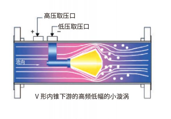 V形内锥式节流装置包括一个在测量管中同轴安装的尖圆锥体和相应的取压口。该测量管是预先精密加工好的,在尖圆锥体的两端产生差压。此差压的高压(正压)是在上游流体收缩前的管壁取压口处测得的静压力,而低压力(负压)则是在圆锥体朝向下游端面,锥中心轴处所开取压孔所得。而其高低压之差的开平方与其体积流量成正比关系,通过测量V锥上下游的差压进而得出流量。