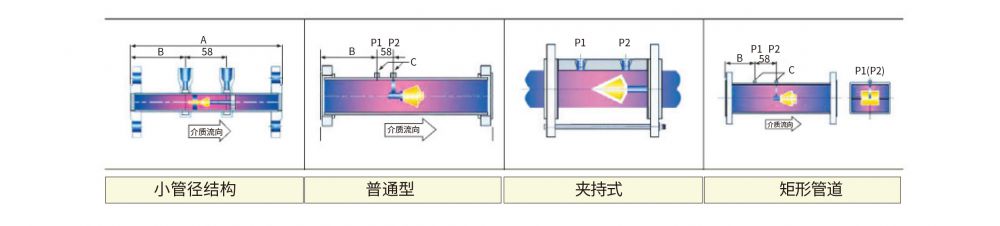 V锥流量计按其结构分为:夹持式、通用型、大管径结构、小管径结构等结构具体形式见下表:
