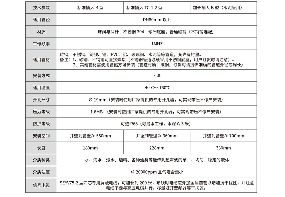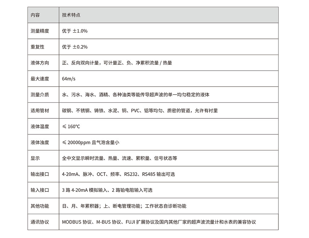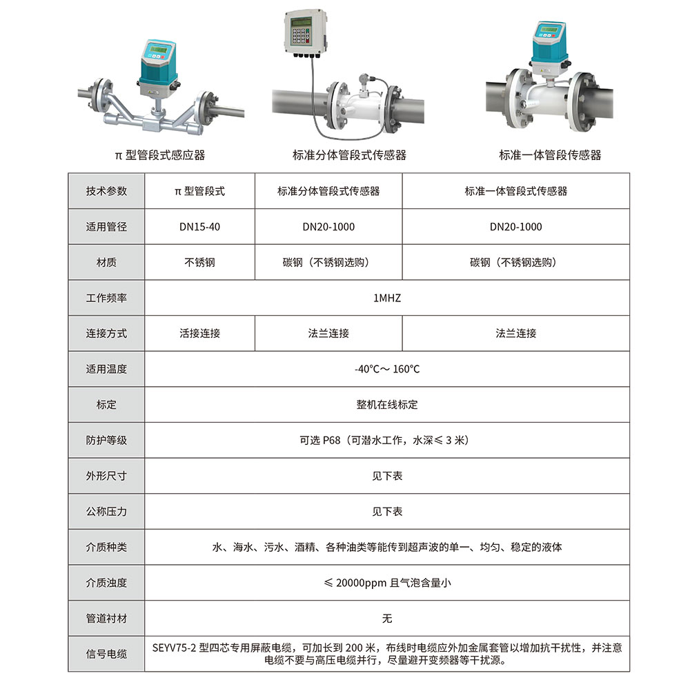 为满足现场实际工况和客户需求,本系列超声波流量计提供了外贴式、插入式、管段式三种传感器供用户选择。