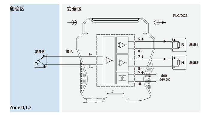 AYK1系列热电偶输入安全栅 ,将危险区的热电偶,经隔离转换为电流信号输出到安全区,具有冷端补偿功能。该产品需要独立供电,输入、输出和电源三端隔离。具有在线故障自诊断功能,可以通过PC端或手持编程器对温度量程和信号类型,以及信号故障时输出模式进行组态。